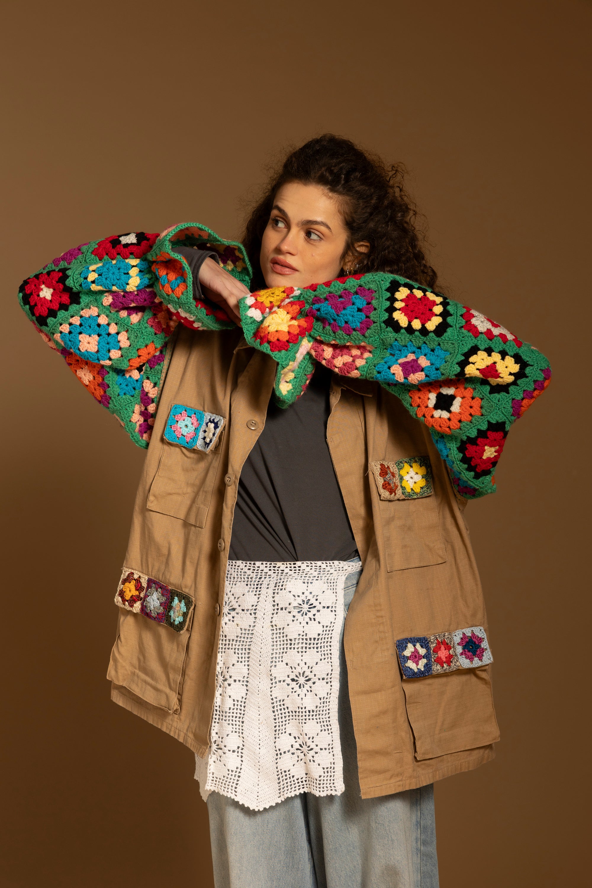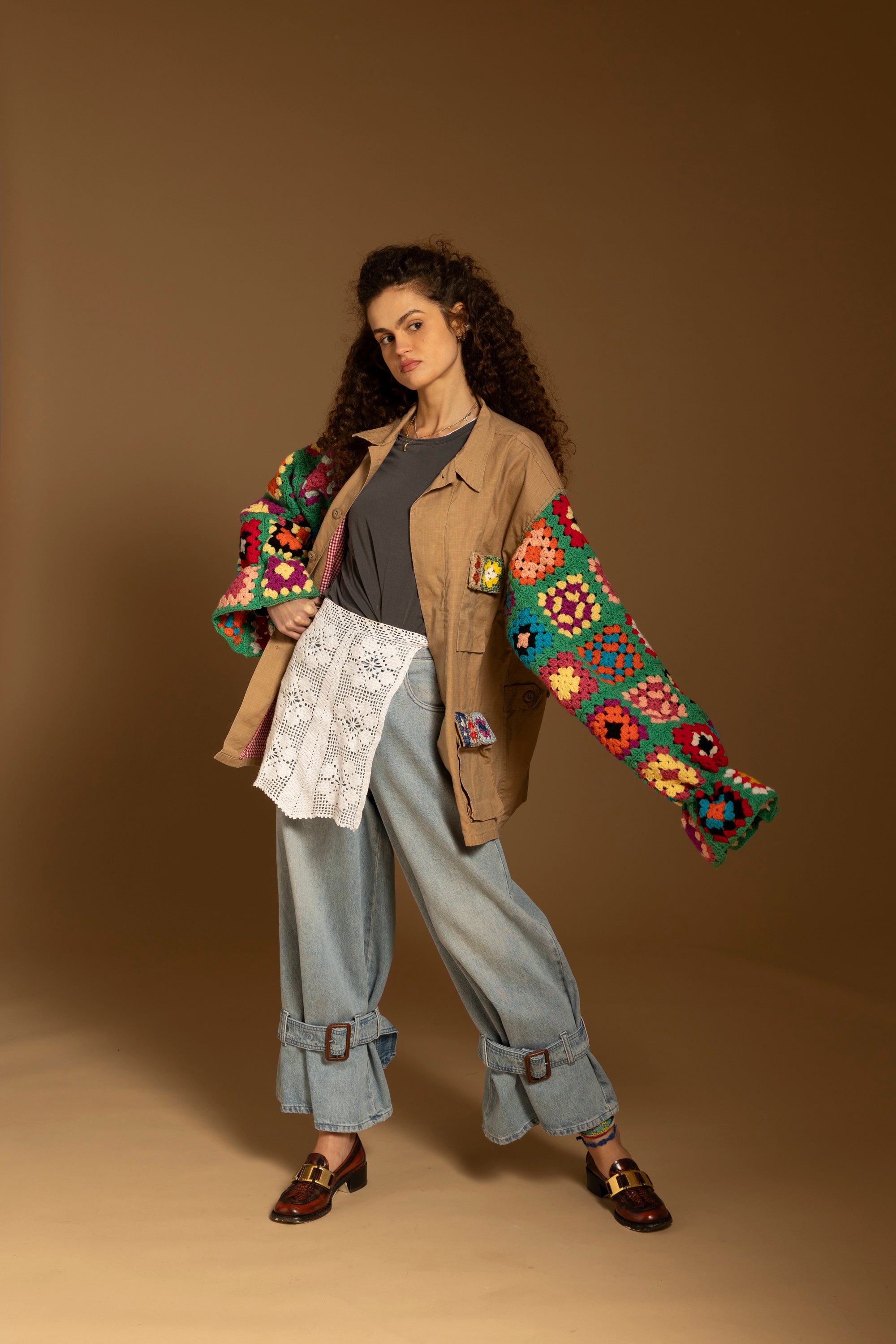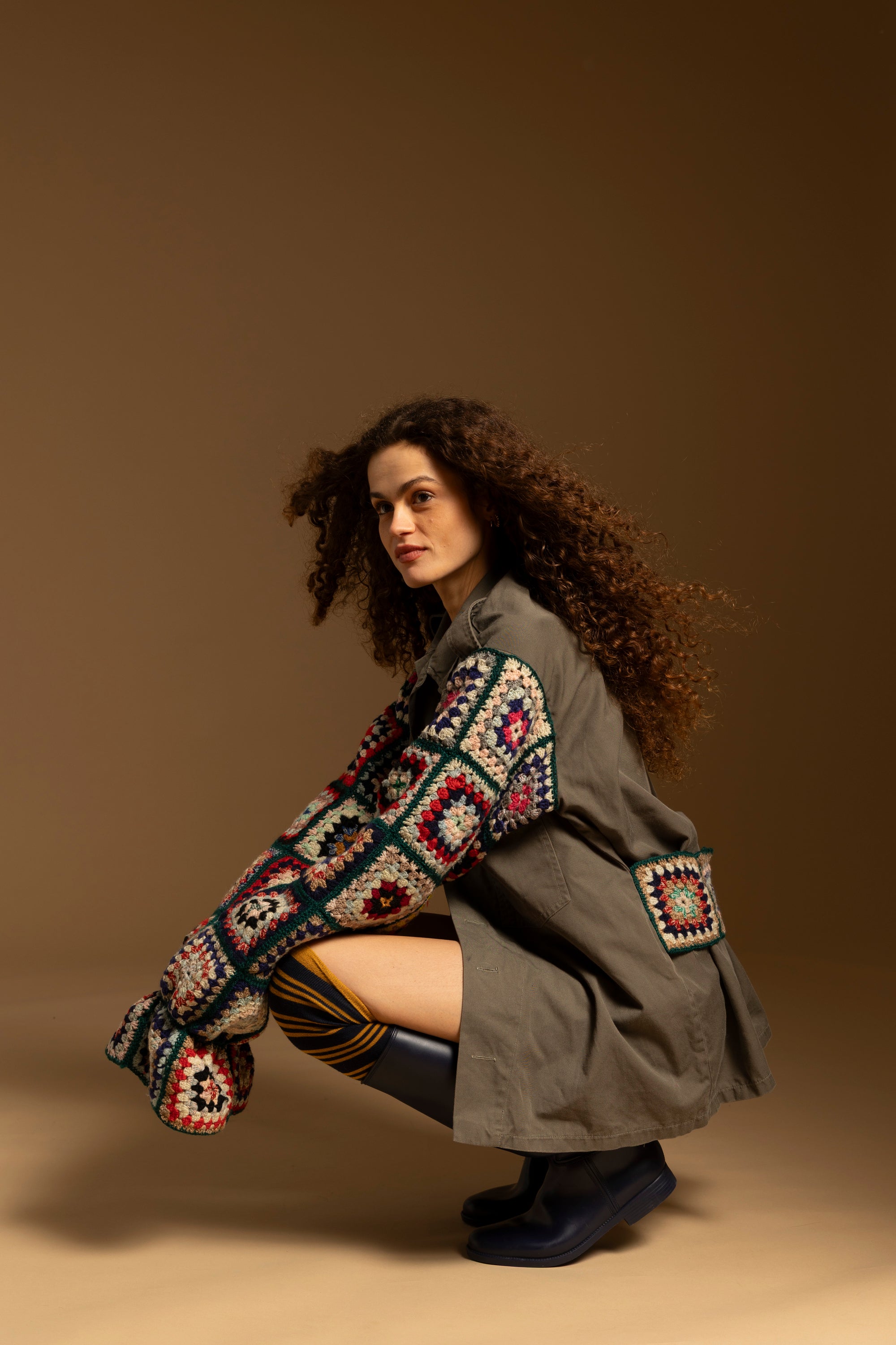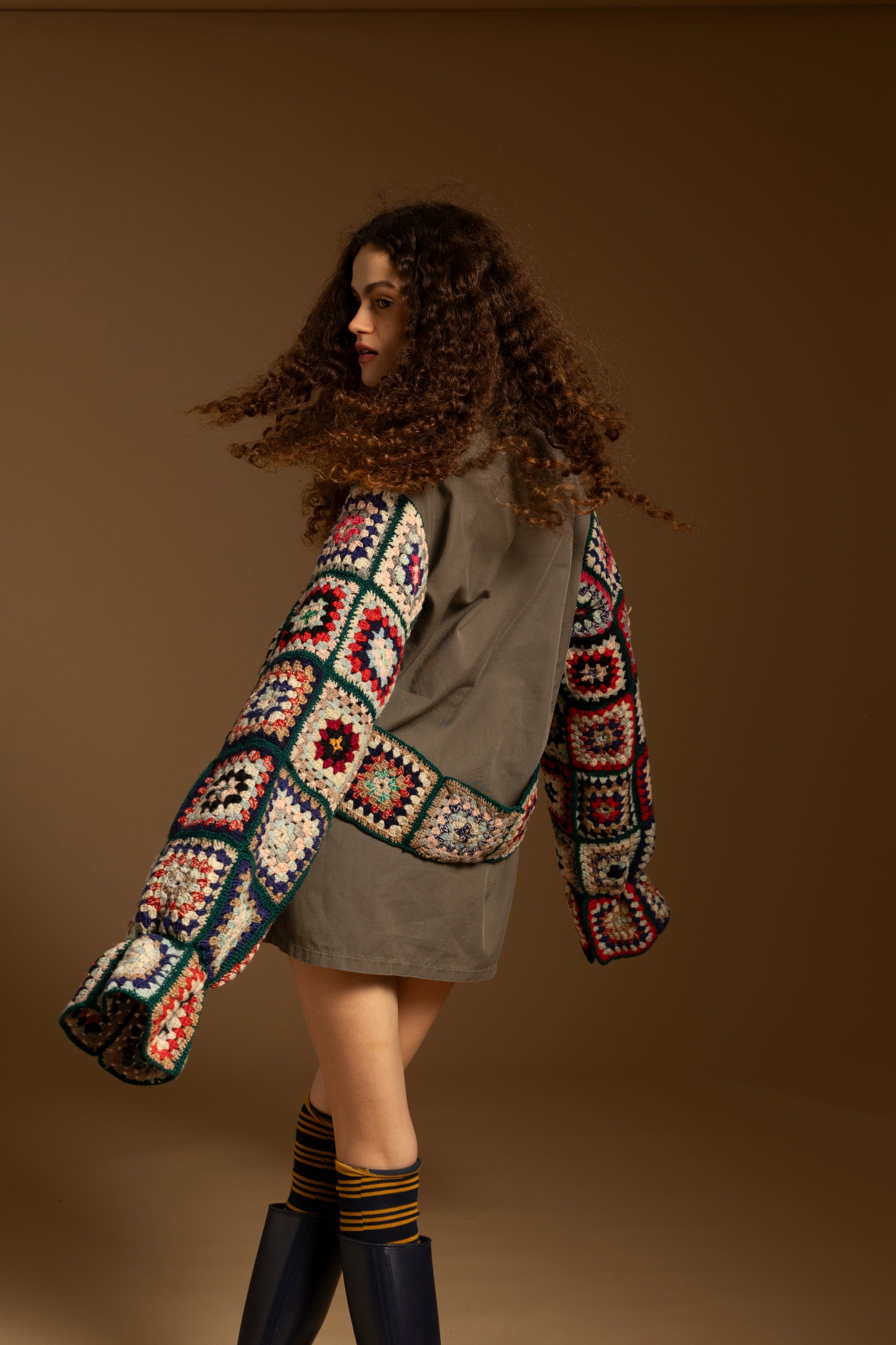 Ogni giacca nasce da una selezione accurata nel second-hand e viene trasformata con applicazioni all’uncinetto in 100% lana, realizzate interamente a mano con i filati signature di Almace provenienti da deadstock.