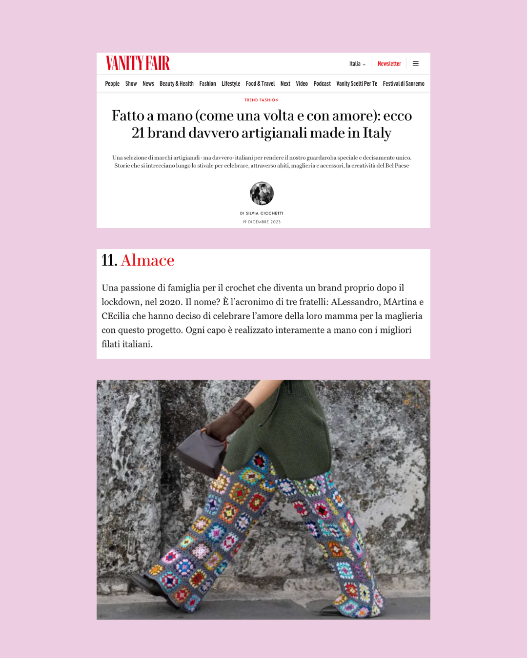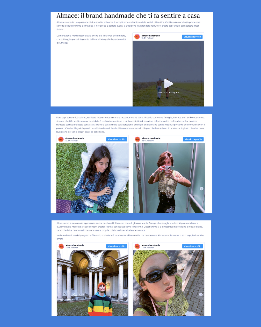 Almace nasce da una passione di due sorelle, e il nome è semplicemente l’unione delle iniziali di Martina, Cecilia e Alessandro (le prime due sono le ideatrici l’ultimo è il fratello). Il loro scopo è portare avanti la tradizione integrandola nel futuro, creare capi unici e combattere il fast fashion.