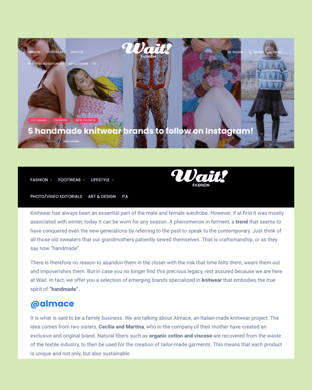 Almace è un brand marchigiano di maglieria ecosostenibile handmade nato in piena pandemia dall'estro creativo di due giovani sorelle: Cecilia e Martina Tornati.